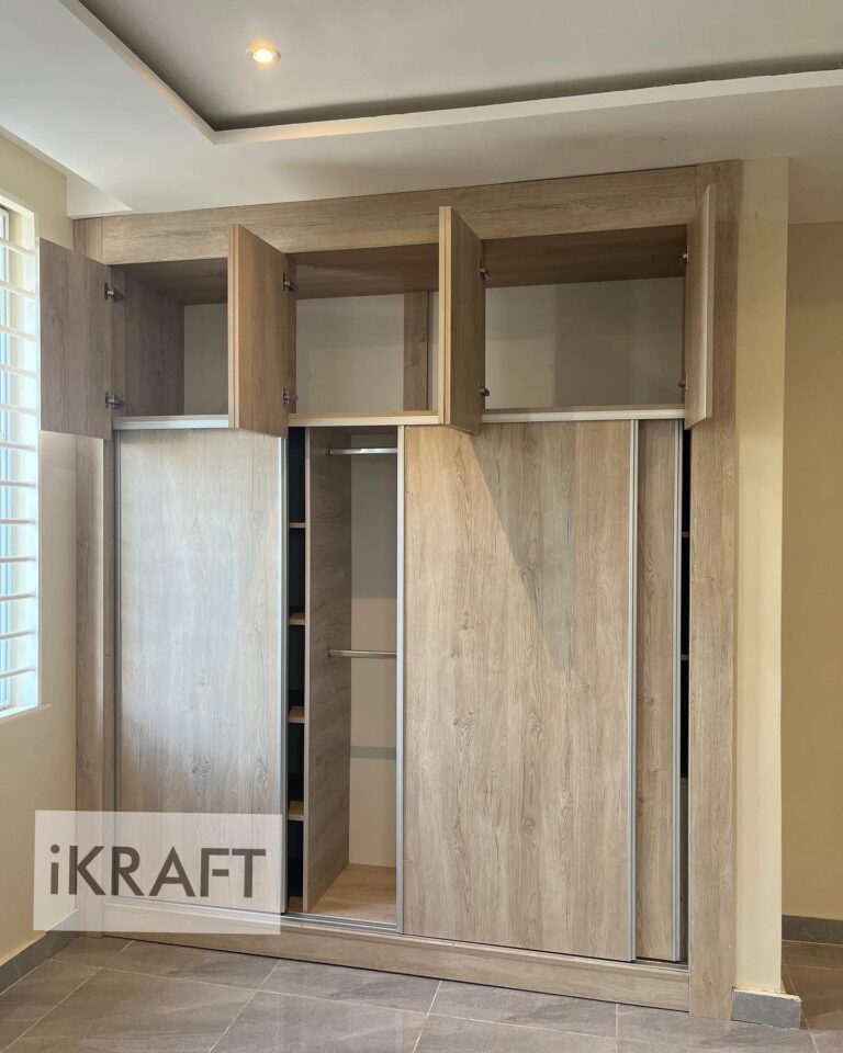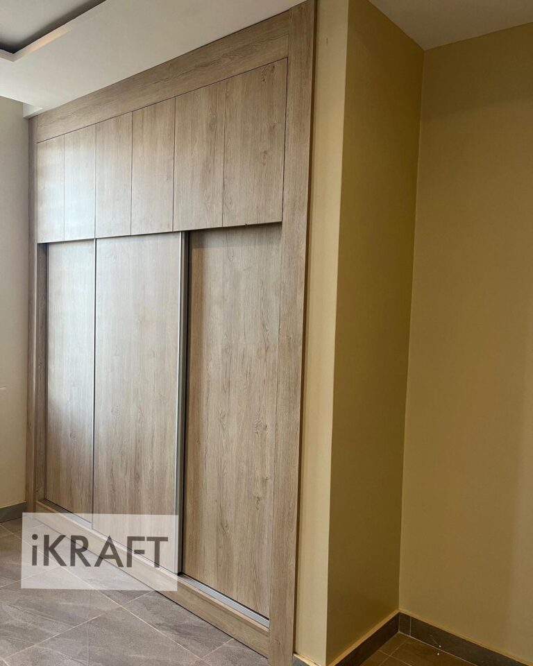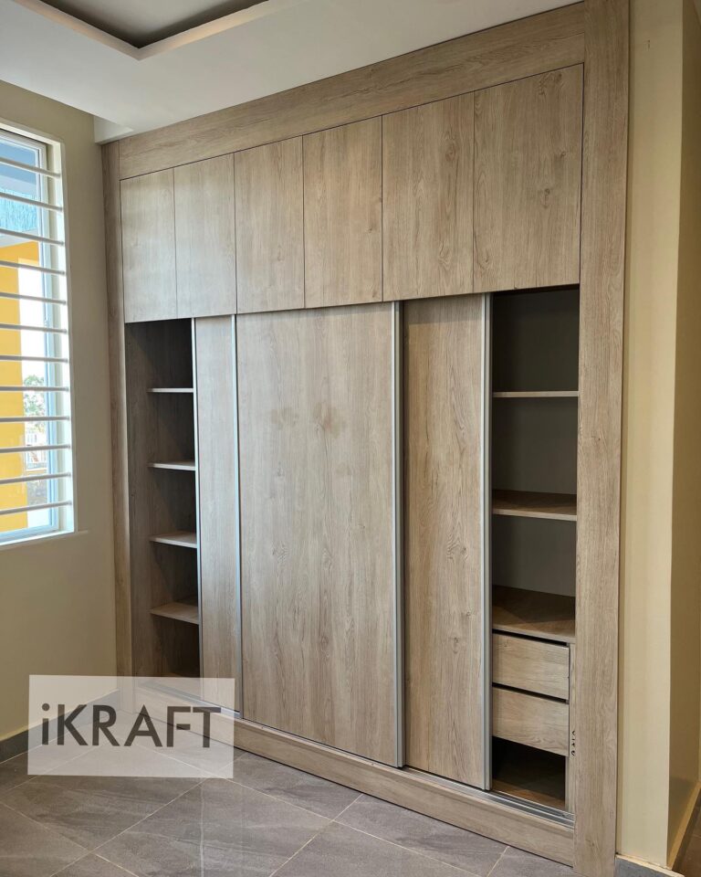 This light brown, wooden 3-door sliding wardrobe offers both style and practicality, featuring a sleek design with easy-to-use sliding doors and a spacious top compartment. The warm wood tones add a natural elegance, while the ample storage keeps your space organized and clutter-free. Perfect for a modern touch that blends seamlessly with any interior.