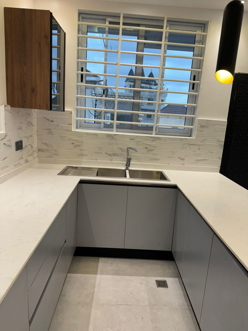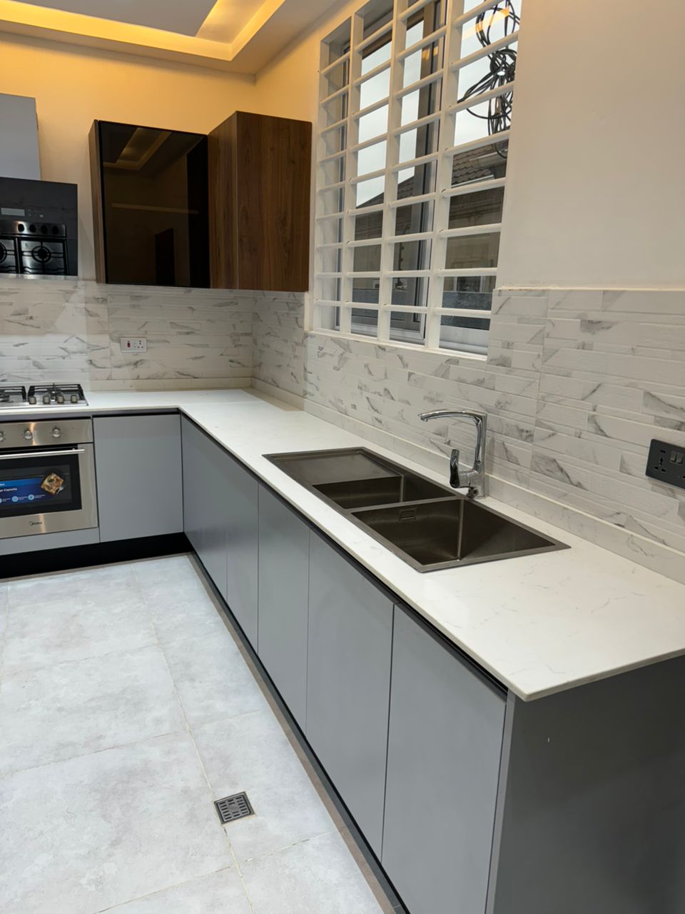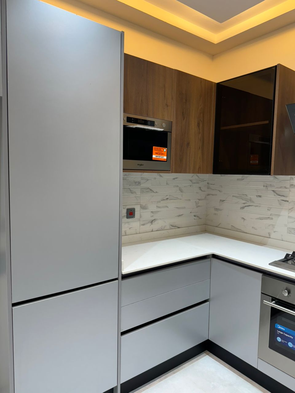 A kitchen that redefines elegance—silver-tone cabinets paired with rich dark-brown accents create a striking balance of modern sophistication and timeless warmth. The sleek, reflective finish of the silver cabinets brightens the space, while the dark-brown blend grounds the design with a sense of depth and character. Together, these elements form a harmonious contrast, offering a functional yet visually captivating space that feels both luxurious and inviting.